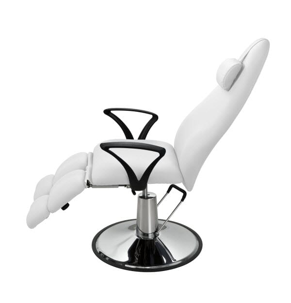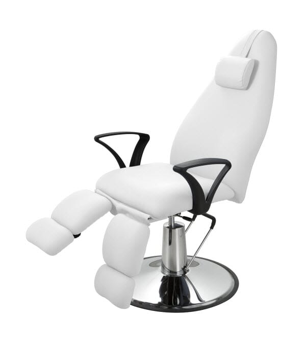 Roterende fotpleiestol med en veldig stabil base i krom. Justerbar høyde regulering med hydraulisk pumpe med brems. Ryggen og uavhengige fothvilere justeres med gassløft. Hvit PVC sømløs trekk av høy kvalitet og enkel rengjøring. Avtakbar nakkestøtte pute.