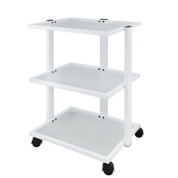 Tralle i metall. Hvit farge med et enkelt og praktisk design. Det er utstyrt med tre romslig hyller for plassering av utstyr. Glass hyller. Enkelt å flytte rundt. Kommer med hull til lampe.Spesifikasjoner:Vekt: 16kgDimensjoner: B60xD45xH80 cm