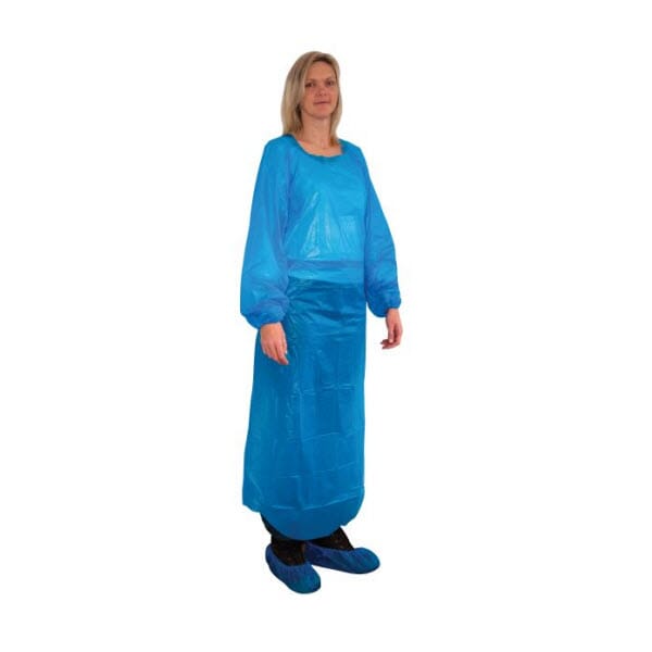 Engangs plastik Kittel med elastisk avslutning ved håndledd.